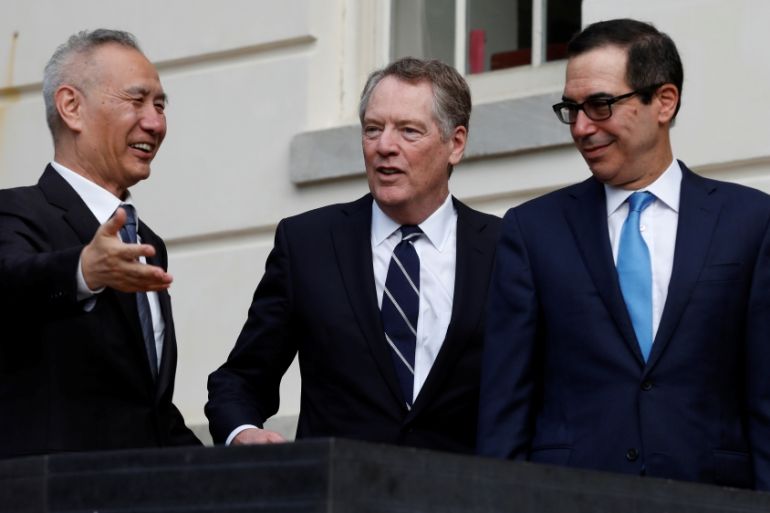 China said its Vice Premier Liu He, far left, spoke to US Treasury Secretary Steven Mnuchin, far right, and US Trade Representative Robert Lighthizer in a phone call on Tuesday [File: Yuri Gripas/Reuters]