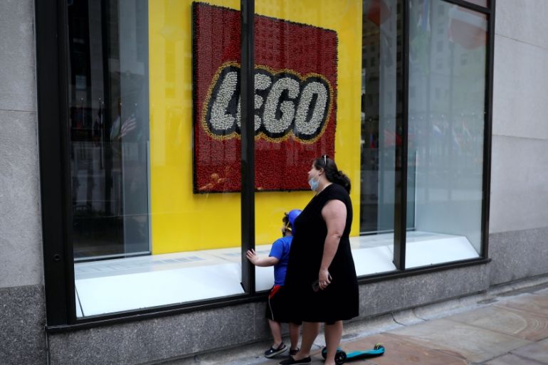 A woman and a child look through the windows of the closed Lego store at Rockefeller Center on 5th Avenue during the outbreak of the coronavirus in Manhattan, New York, US [File: Mike Segar/Reuters]
