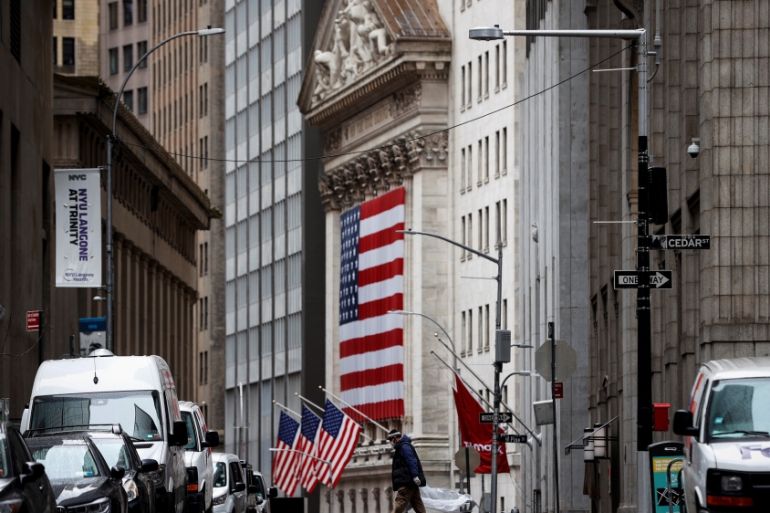 A man crosses a nearly deserted street in front of the New York Stock Exchange in the financial district of lower Manhattan during coronavirus outbreak in NY, US, where President Trump has warned that the next few weeks will be 'the toughest' [Mike Segar/Reuters]