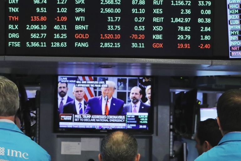 In a volatile session, all three main indexes jumped more than six percent in early trading before paring to a gain of as little as 0.55 percent on the S&P 500 before rallying towards the close as Trump made the announcement with industry leaders of about $50bn in federal aid to fight the disease.