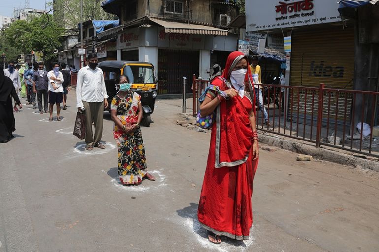 Indians stand in marked positions to buy essential commodities from a grocery store in Mumbai as India went into a 21-day lockdown to limit the spread of the coronavirus [File: Rafiq Maqbool/The Associated Press]