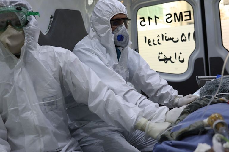 Emergency medical staff wearing protective suits in Iran, where United States economic sanctions have deprived the government of resources to fight the pandemic [File: WANA (West Asia News Agency)/Ali Khara via Reuters]