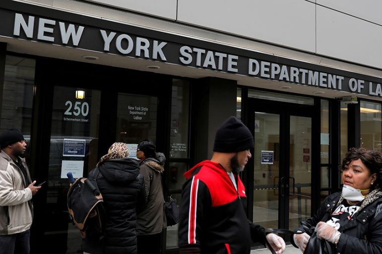 People gather at the entrance for the New York State Department of Labor offices in Brooklyn; the office is closed to the public as part of measures to stop the spread of COVID-19 measures that have spawned a record number of layoffs in the US [File: Andrew Kelly/Reuters]