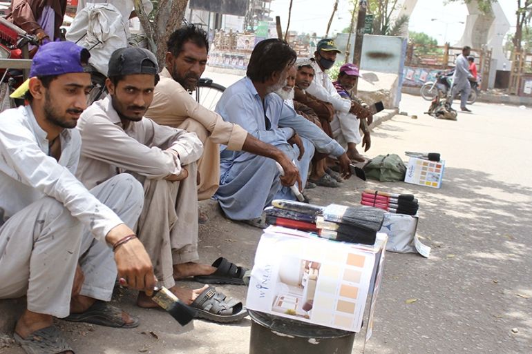 Daily-wage workers wait to get hired during a full coronavirus lockdown in Hyderabad, Pakistan [Nadeem Khawer/EPA]