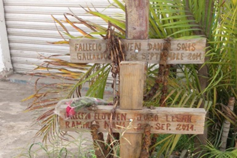 Two simple wooden crosses bearing the names of two students killed in the street stand as a memorial.