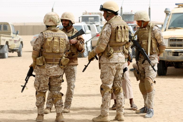 Saudi troops stand at an airfield, where Saudi cargo planes delivered aid, in the northern province of Marib