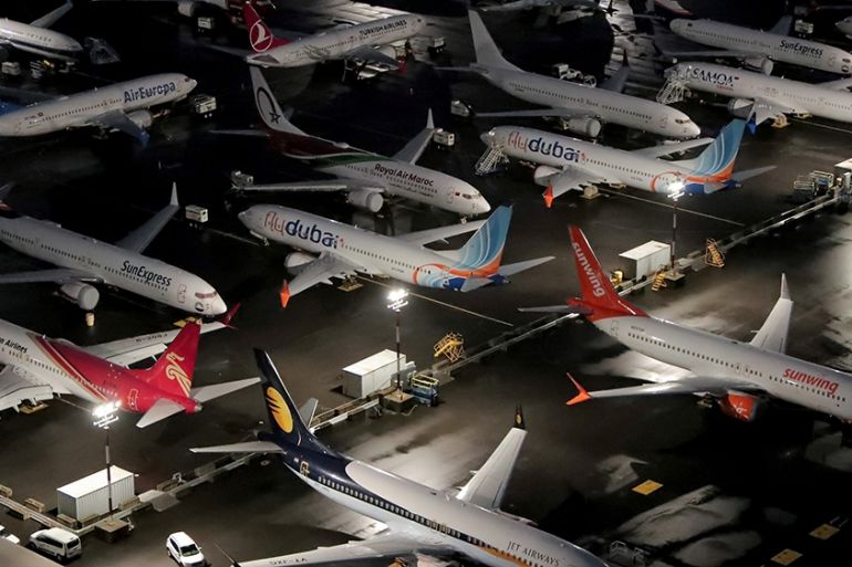 Boeing and the FAA are grappling to contain a crisis in the wake of two 737 MAX crashes that have left 346 people dead, forced airlines to ground more than 300 aircraft, and put on hold Boeing deliveries worth more than $500bn [File: Gary He/Reuters]