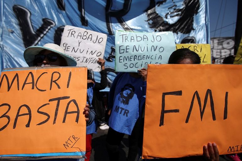 During a September demonstration against incumbent Argentine President Mauricio Macri's economic policies, people hold placards reading "Macri, Stop" and "IMF" [File: Agustin Marcarian/Reuters]