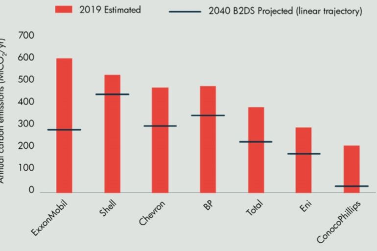 Oil majors must cut output by 35 percent overall by 2040, says the report, which notes that each company’s carbon budget depends on “the proportion of low-cost, low-carbon projects in their portfolio”.
