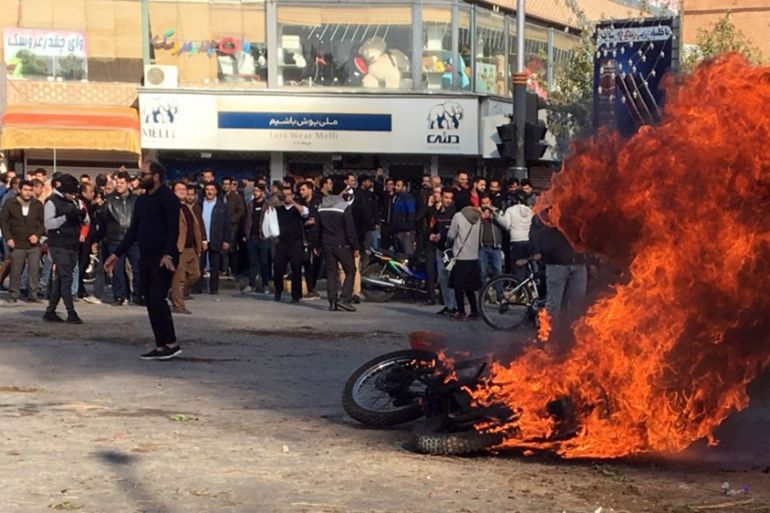 Videos posted on social media purportedly showed protesters setting fire to buildings and clashing with riot police. In other videos, they appeared to block roads and set fires in the streets of the capital, Tehran, and some other cities.