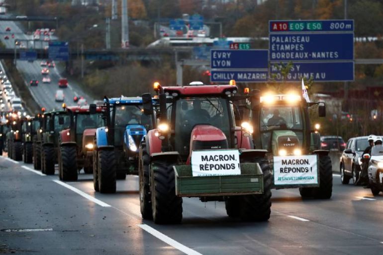 The National Federation of Farmers’ Unions (FNSEA) and Young Farmers (Jeunes Agriculteurs) called this protest collectively to demand change on several fronts: The economic insecurity faced by many farmers, almost one third of whom earn less than 354 euros ($390) a month, what they deem as unfair competition with farmers from countries with less strict food quality norms, and the perceived defamation of French farmers by urban populations and politicians who curry favour with them – a phenomenon evocatively named “Agribashing“.