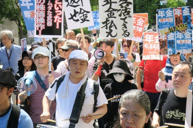 At a rally of several hundred people in central Tokyo on Sunday, protesters accused Abe’s government of financial bungling and waved placards reading: “Give us back our pensions!” Hanae Nakao, 37, who joined with her baby, said the government had its spending priorities wrong.