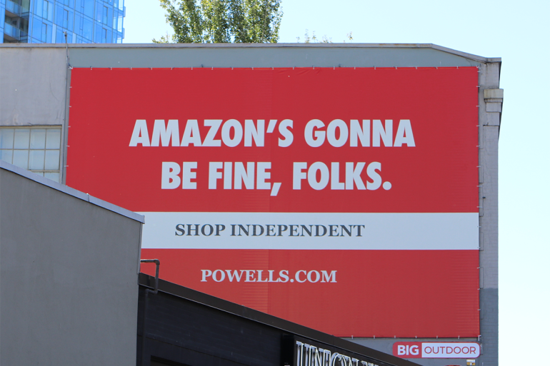 Emily Powell, the third-generation owner of Powell’s Books in Portland, Oregon, decided to put the writing on the wall. A billboard outside of her flagship store now reads: “Amazon’s gonna be fine, folks. Shop independent.”