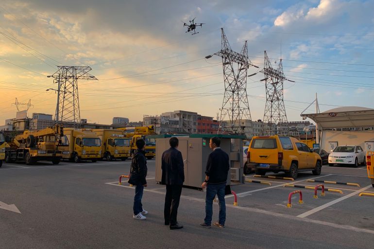 Down a side street near Shenzhen’s university cluster, a drone swoops down between low-slung, graffiti-covered buildings, coming to rest in a large utility box where a robotic arm swaps out its batteries for new ones. Moments later the drone rises and whizzes off again to carry on its work.