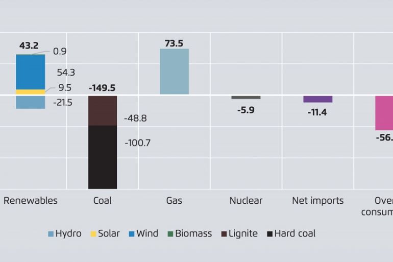 Meanwhile, hydropower shrunk six percent as a result of ongoing drought, while nuclear power – reliant on river water for cooling – was also impacted by summer dryness.
