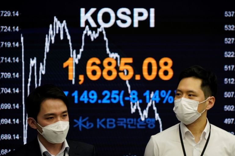 In South Korea, the benchmark Kospi sank more than 7 percent to trigger a trading halt in the morning, later recovering to 5.2 percent down from the previous close.