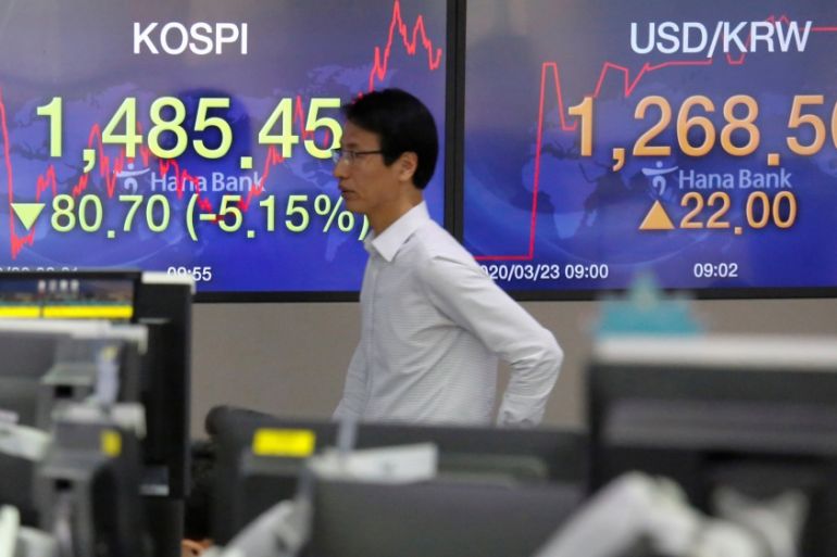 Kuala Lumpur, Malaysia – Nervous investors grappling with the costs of an economic standstill arising from the coronavirus pandemic sold more stocks on Monday, once again punishing Asian share markets.