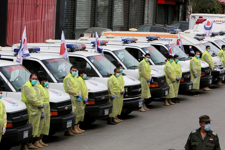 Islamic health unit personnel wearing protective gear stand near ambulances as part of preparation to help tackling the coronavirus disease (COVID-19) outbreak, during a media tour organised by Hezbollah officials in Beirut's southern suburb [File: Aziz Taher/Reuters]