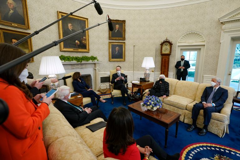 Biden is eager to keep attention on his relief package even as Washington focuses on the second impeachment trial of former President Donald Trump, who is accused of inciting the January 6 riot at the US Capitol. The meeting served as a bit of counterprogramming at the White House while the trial kicked off in the US Senate.