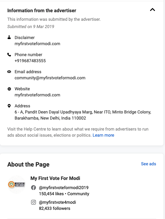 Among the 23 advertisers that TRC found promoting BJP without publicly disclosing any association with the party, it could trace six advertisers to the BJP. Advertisers myfirstvoteformodi.com, Nation with Namo, NationWithNamo.com, and Bharat Ke Man ki Baat do not disclose any formal association with the BJP on their Facebook Pages or websites but listed the BJP headquarters in Delhi as their physical address on Facebook’s advertisement platform (NaMo refers to Narendra Modi). Together, these four advertisers spent more than 32.4 million rupees ($423,060) on more than 12,328 pro-BJP ads.