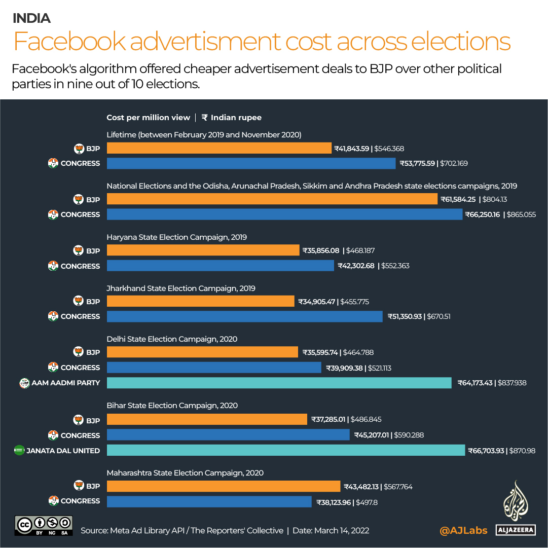 On average, Facebook charged the BJP, its candidates and affiliated organisations 41,844 rupees ($546) to show an ad one million times. But the main opposition party, the Indian National Congress, its candidates and affiliated organisations had to pay 53,776 rupees ($702)— nearly 29 percent more—for the same number of views.