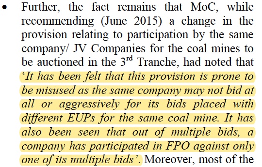 It further elaborated that “even assuming that bidders for a particular mine belong to the same company, some of them would still have to bid aggressively in order to qualify in the top 50%”.