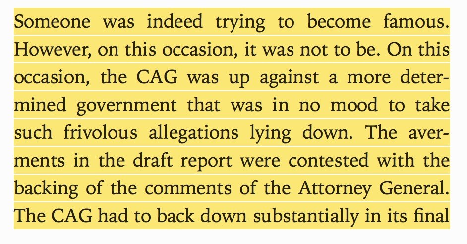Anil Swarup, the former coal secretary who oversaw the auction, cast doubt on the findings of CAG. In his memoir, Not Just a Civil Servant, he boasted that the government ensured many of CAG’s initial findings did not make it to the final report tabled before Parliament.