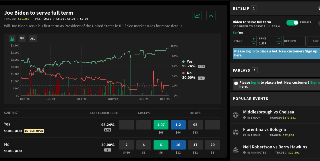 Individual event contracts on Kalshi are less than a dollar but that can really vary across the sector. On Smarkets for example, as of January 9, the last traded minimum price on [US President] “Joe Biden to serve full term” was $1.05. Across the sector, there is nothing stopping users from buying a lot of that, much like they would for shares in a company.
