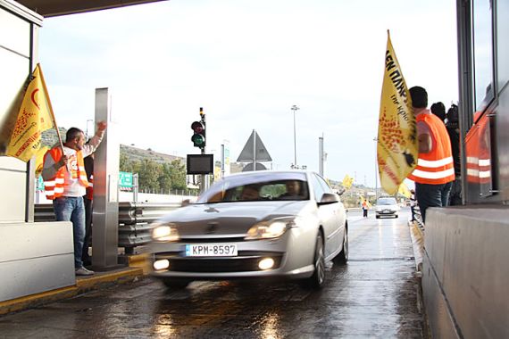 | Activists from the Den Plirono [‘Don’t Pay’] group swamp the toll booths, move the barriers and wave their bright yellow flags, allowing vehicles to pass through – saving each driver 3.05 euros on their journey [Global News Insight] |