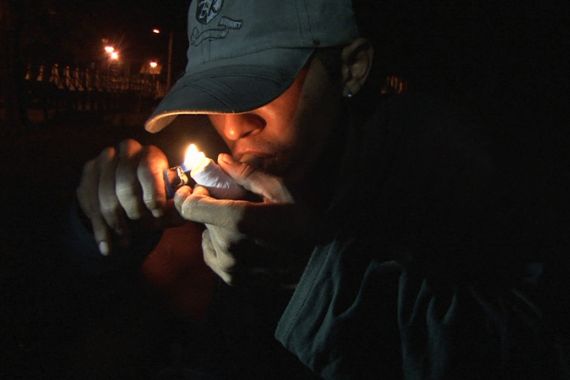 Then he ignites the lighter, puts the pipe to his lips, and slowly burns the rock whilst inhaling deeply.