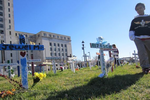 Dozens of crosses with the names of those slain this year populate the manicured lawn of City Hall, as mourners and concerned citizens recently held a requiem.
