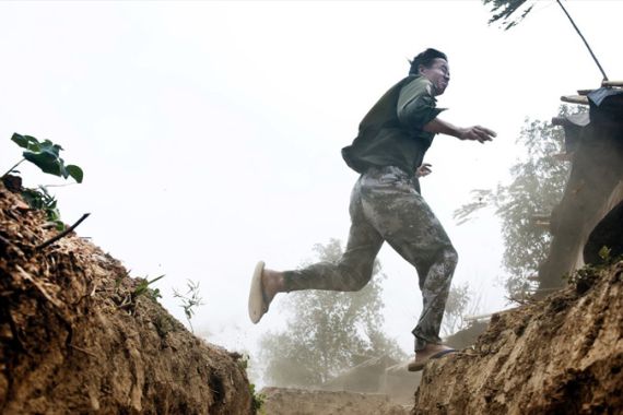 On a lonely mountaintop, at the front lines of the Kachin Independence Army (KIA), Third Brigade, a small group of soldiers, smoking cheroots and drinking homemade rice alcohol, take cover from the rain under a small tent.