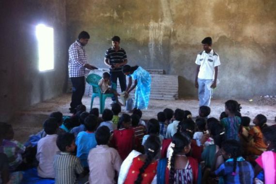 Two women organisers, who have been trained by Amarnath’s team for leadership and community development, had assembled about 50 children for the shoe distribution event.