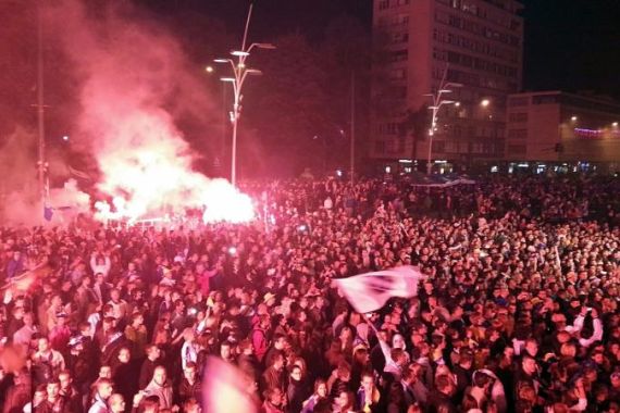 They gathered in front of Sarajevo’s Catholic cathedral, where they waved flags and sang songs.