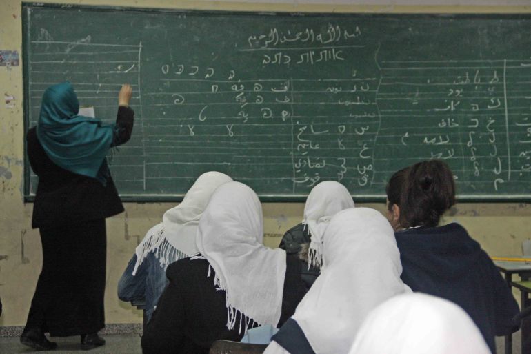 At Hasan Salama prep school in Gaza City, dozens of female 9th-graders learn to write the Hebrew alphabet’s handwritten script. In the first semester, they had learned how to read the language’s printed letters.