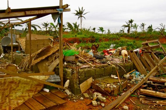 Boston, Davao Oriental, Philippines – Larisa Loreto is leaving her husband, her two young daughters, and her home, which Typhoon Bopha left in a collapsed heap along the main highway. Goats, dogs and a kitten rummage through what is left of her family’s belongings.