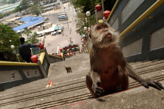 “I come here because I want my daughter to know about the monkeys,” said local businessman Zul Kamarulzaman, cradling his one-year-old girl in his arms and protecting her from the rain.