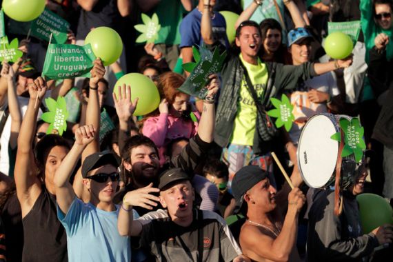 | People in the capital Montevideo demonstrate for the recently passed bill legalising pot[Reuters] |