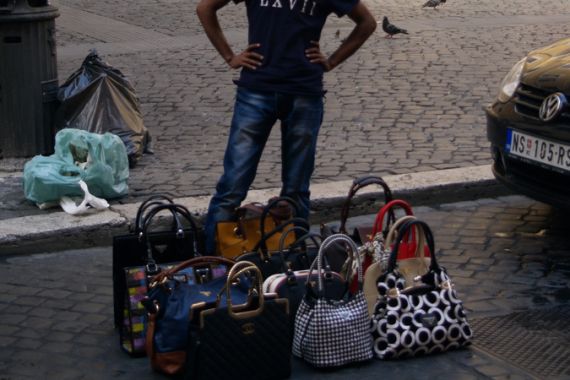 At 3pm the autumn sun in Rome is still harsh and the crowds near the Trevi fountain are thinner than usual. Walking past his stall, a few stragglers in the American group slow down to look at Faisal’s shining “Chanel” and “Prada” handbags arranged in neat rows on the ground, then shuffle on hurriedly.
