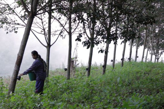 But with the cash crop came extended and unusual working hours for farmers. They tap rubber trees in the dark hours before dawn, collecting the flowing latex before it hardens in the midday heat.