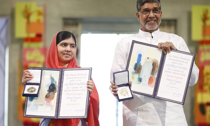 Pakistani schoolgirl shot for advocating right to education and Indian child-rights campaigner share award in Oslo.