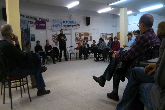 At the civic centre, those in attendance are debating the imminent closure of a local health centre, coordination with other Podemos chapters, and broader issues such as a wave of political scandals.