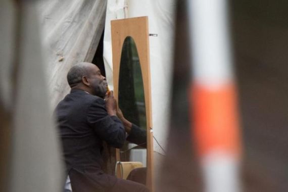 Around them, everyday life goes on: Outside one tent, some inhabitants have set up a makeshift barber’s shop and are shaving each other’s heads.