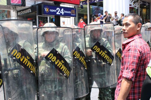 Soldiers holding riot shields held the line in front of the fast-food restaurant and others lurked above on the stairs of the mass transit Skytrain, ready for action.
