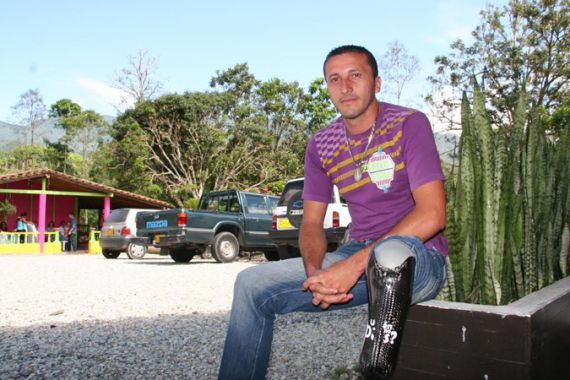 Jamer Atehortua Tobon, a soldier who lost his leg in a landmine explosion while battling Marxist rebels, sits in the front seat. Several years after receiving his injuries, he is still trying to make sense of the violence which has claimed more than 215,000 lives, including some of his friends.