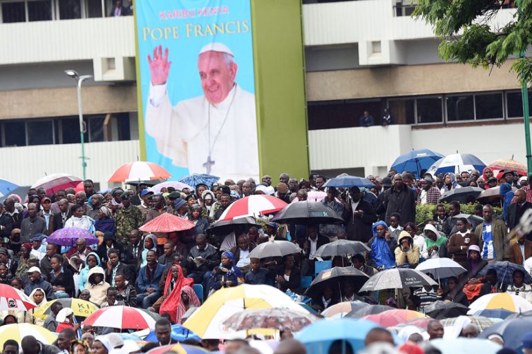 Despite rain, worshippers gather to greet Pope Francis on his visit to Kenya and attend mass.