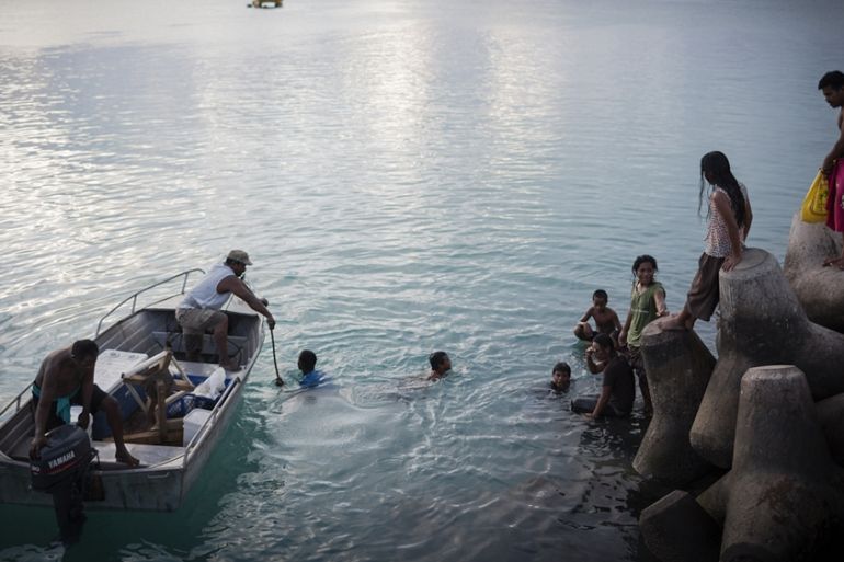 | Forty-year-old Moaniba Ratitaake, left, is a fisherman and supports his family by selling his catch. He lives on land owned by his wife’s family in Eita village on South Tarawa Island. But while he could once drive all the way to his house, for the past few years most of the land has remained underwater during high tide. Moaniba plans to build more seawalls but concedes that this will only be a short-term fix for what will inevitably be uninhabitable land [Conor Ashleigh/Global News Insight] |