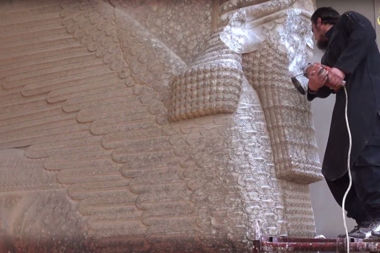 ![An ISIL militant uses a power tool to destroy a winged-bull Assyrian protective deity at the Ninevah Museum in Mosul, Iraq [AP]](https://www.aljazeera.com/wp-content/uploads/2015/03/5422550717034a37b2b15060e1a5cbdd_18.jpeg?resize=770%2C513&quality=80)