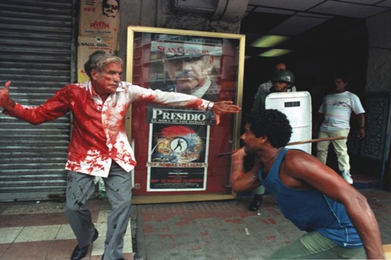 There was a tense standoff, but we had nowhere to go. I suddenly heard a great shout and looked towards a small green hill in the park. Men in shirts of purple and yellow, holding flags in one hand while some carried sticks and bats in the other, came running towards us. Gunfire erupted. It was difficult to understand what was happening and where the candidates were. Then I saw a man stumble out of an SUV. It took me a while to realise that it was the vice-president elect. His white shirt was covered in blood; that of his bodyguard, who’d died protecting him, and his own from knife wounds to his arm. He was trying to gather himself, and I was photographing him as I heard somebody say to me: “con permiso.” I moved slightly as one of the paramilitaries, armed with a pipe, began to attack. The vice-president was twice the age of his attacker, but he fought back and was soon on the offensive.