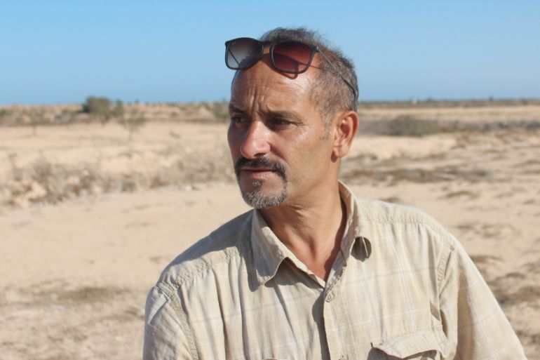 Marzoug stands on a hilly wasteland outside the city of Zarzis in southern Tunisia. The sand is spotted with small bushes and pieces of rubbish, and in the distance are plantations of olive trees.